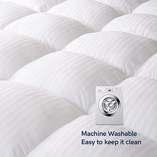 【PREMIUM MATERIAL&SOFT FILLING】Tightly woven and thin brushed microfiber fabric is exceptionally soft, breathable and comfortable. It’s also durable, no risk being ripped even with frequently washing. Compared with traditional mattress topper, it’s double filled with 3D snow down alternative filling, enough soft, plush and warm. Materials are clean, helps diminish the negative outcomes of a person who has sensetive skin.