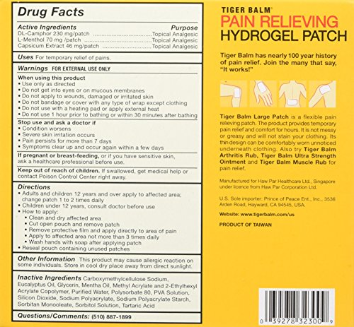 Tiger Balm Large Patch is a flexible pain relieving patch. The product provides temporary pain relief and comfort for hours. It is not messy or greasy and will not stain your clothing. Its thin design can be comfortably worn unnoticed underneath clothing.